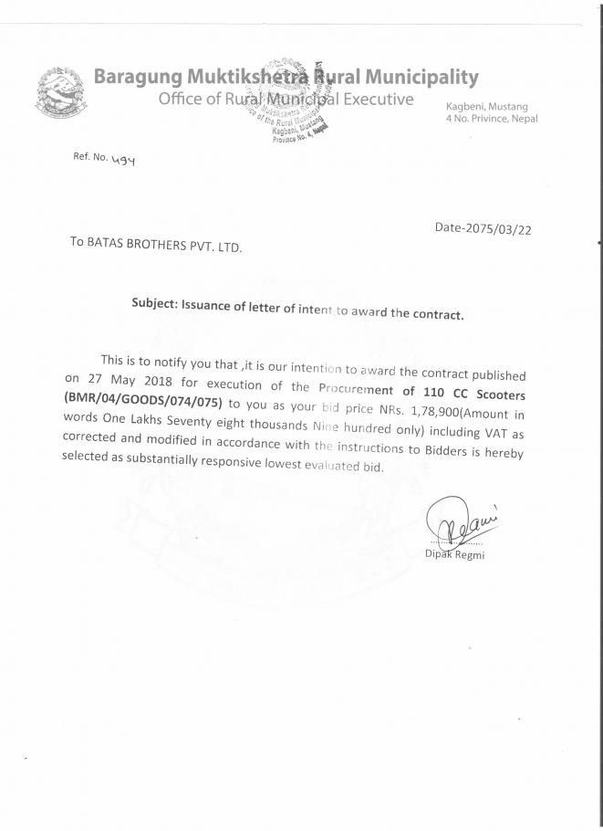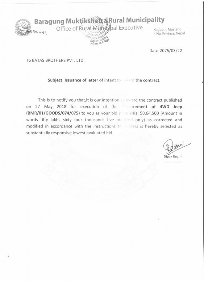 मिति २०७५/०३/ २२ गतेको सवारी खरिदको आशयपत्र यसै साथ संलग्न छ |